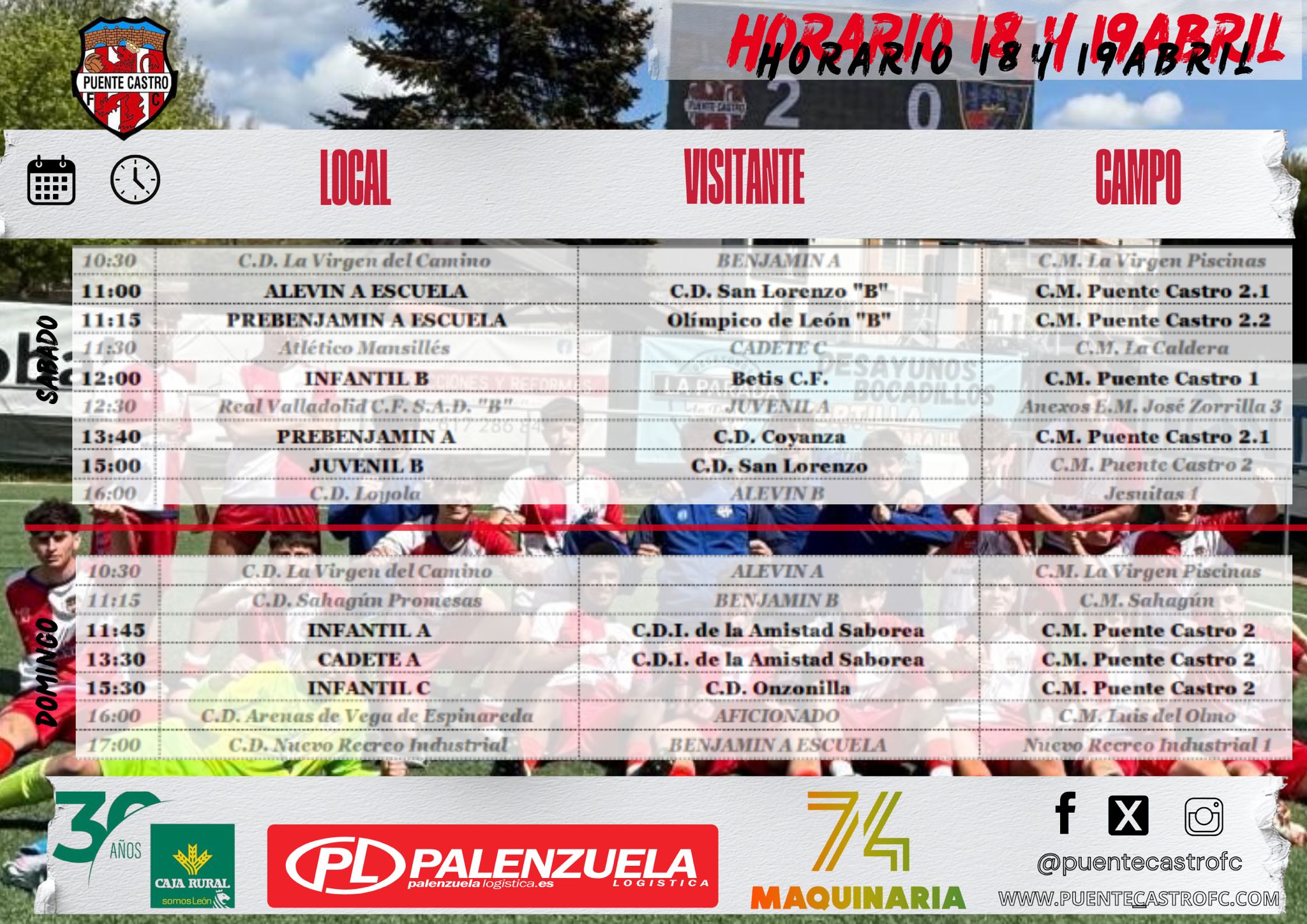 La competición no da tregua en el tramo final de temporada El CD Puente Castro afronta un nuevo fin de semana de competición, apenas sin margen de descanso en este… Vuelve la competición tras Semana Santa con la temporada entrando en su fase decisiva Después del parón de Semana Santa, el CD Puente Castro retoma la competición en un momento… Fin de semana muy completo con victorias de prestigio y competitividad ante grandes rivales El CD Puente Castro firmó una notable jornada los días 14 y 15 de marzo, con… Fin de semana exigente con duelos destacados ante Burgos CF y Ponferradina El CD Puente Castro afronta un nuevo fin de semana de competición los días 14 y 15 de… Gran jornada para la cantera con goleadas, victorias de mérito y competitividad en todas las categorías El CD Puente Castro completó un intenso fin de semana de competición los días… El club arlequinado afronta un nuevo fin de semana cargado de competición con numerosos compromisos en todas las categorías. La jornada se presenta especialmente interesante con varios partidos en casa…Previa | 18 y 19 de abril