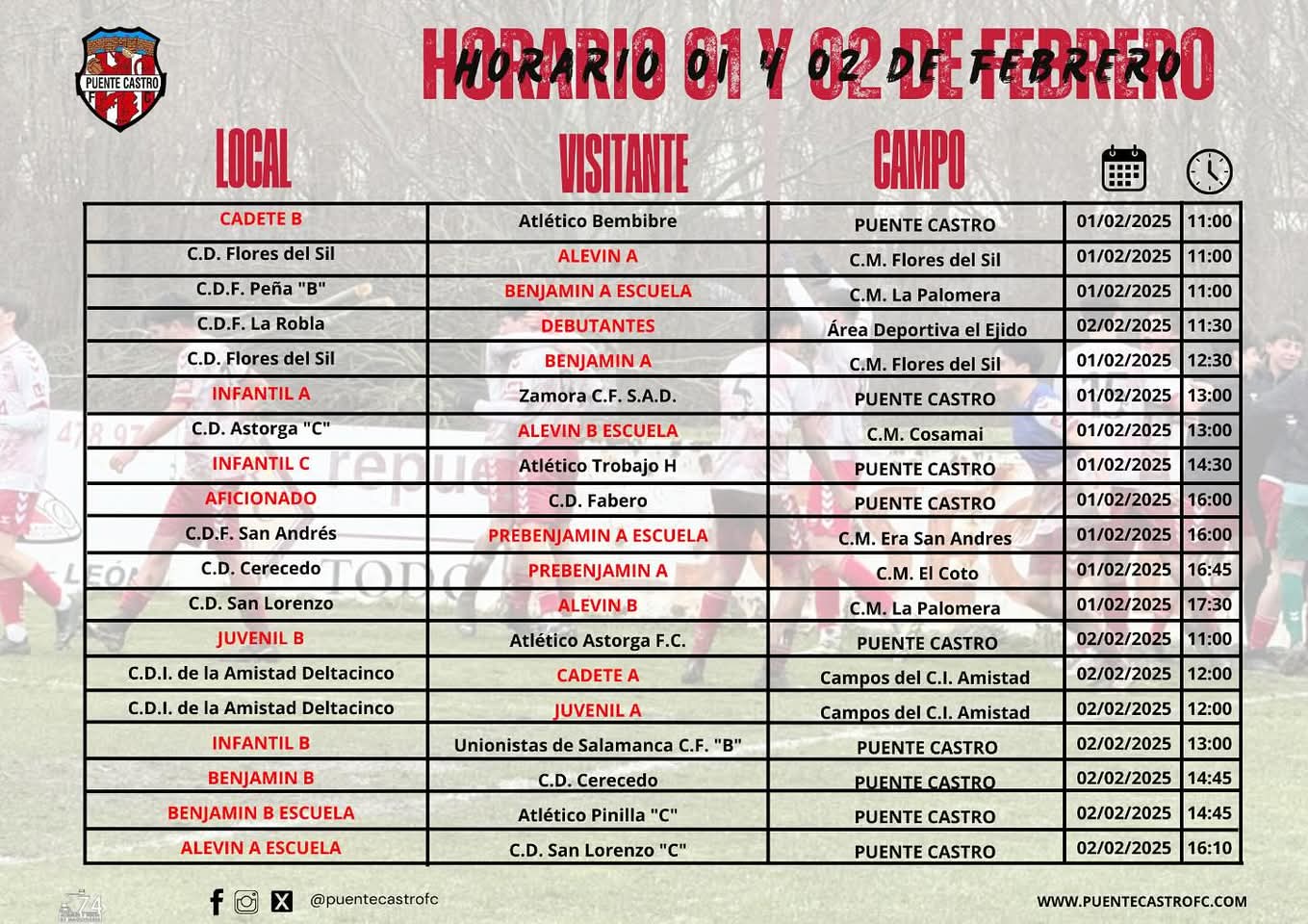 Con el objetivo de reforzar lo conseguido en la última jornada, el Puente Castro FC afronta otro desafío con la misma ilusión y ambición. Desde el Juvenil A hasta la Escuela, nuestros equipos pelearán por seguir sumando y mostrando el gran trabajo que se está haciendo. ¡Vamos Puente Castro! 💪⚽🔴