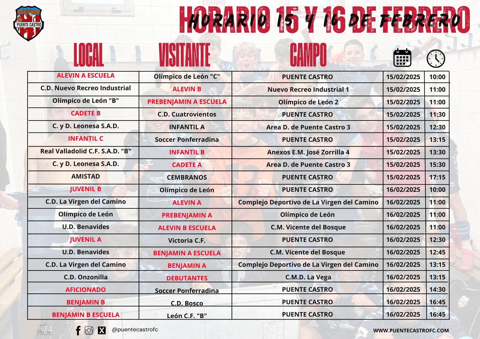 ¡Fin de semana llena de fútbol! La jornada del 15 y 16 de febrero nos trae encuentros apasionantes tanto en casa como a domicilio. Los equipos de Fútbol 11 tienen varios duelos clave, destacando las visitas del Infantil B al Real Valladolid CF «B» y del Juvenil A frente al Victoria CF Además, el Juvenil B se enfrenta a un exigente Olímpico de León, mientras que el Cadete A y el Infantil A tratarán de imponer su juego en Puente Castro.